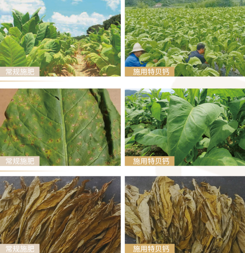 煙葉應(yīng)用效果:與常規(guī)施肥對比,使用瑪塔特貝鈣煙葉長勢更齊,煙葉更挺拔;對病害的抵抗性更好,特別是對野火病防控效果好;煙葉更好烤,且顏色更好看。