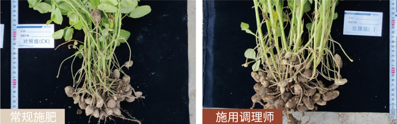 花生應(yīng)用效果:與常規(guī)施肥相比,使用瑪塔調(diào)理師花生葉片更濃綠,根系更加發(fā)達(dá),常規(guī)施肥畝產(chǎn)600斤,使用瑪塔調(diào)理師畝產(chǎn)900斤,產(chǎn)量顯著提升。